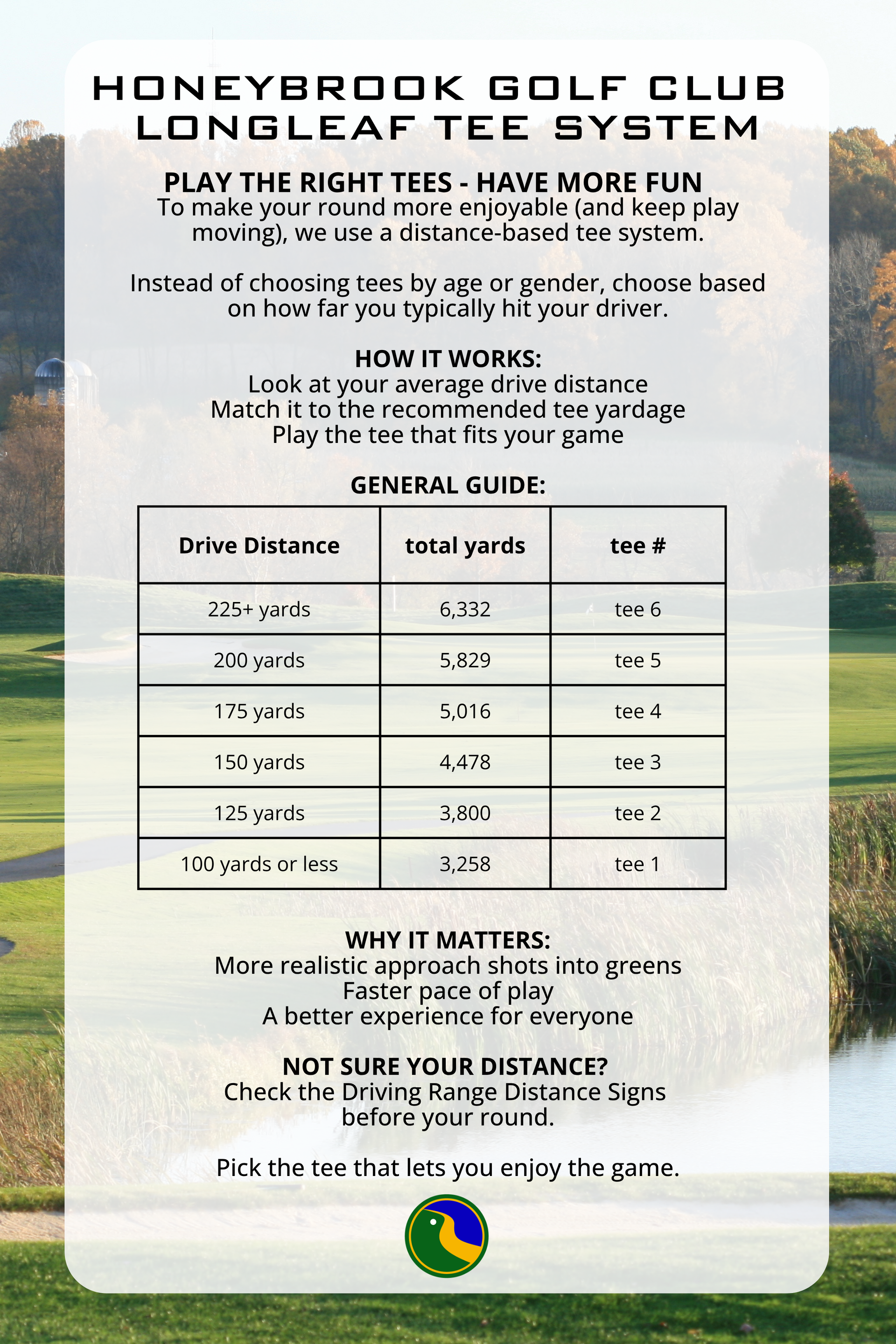 Please use the markers on the driving range to help determine which tees to use. If you have any questions, don't hesitate to ask our staff.